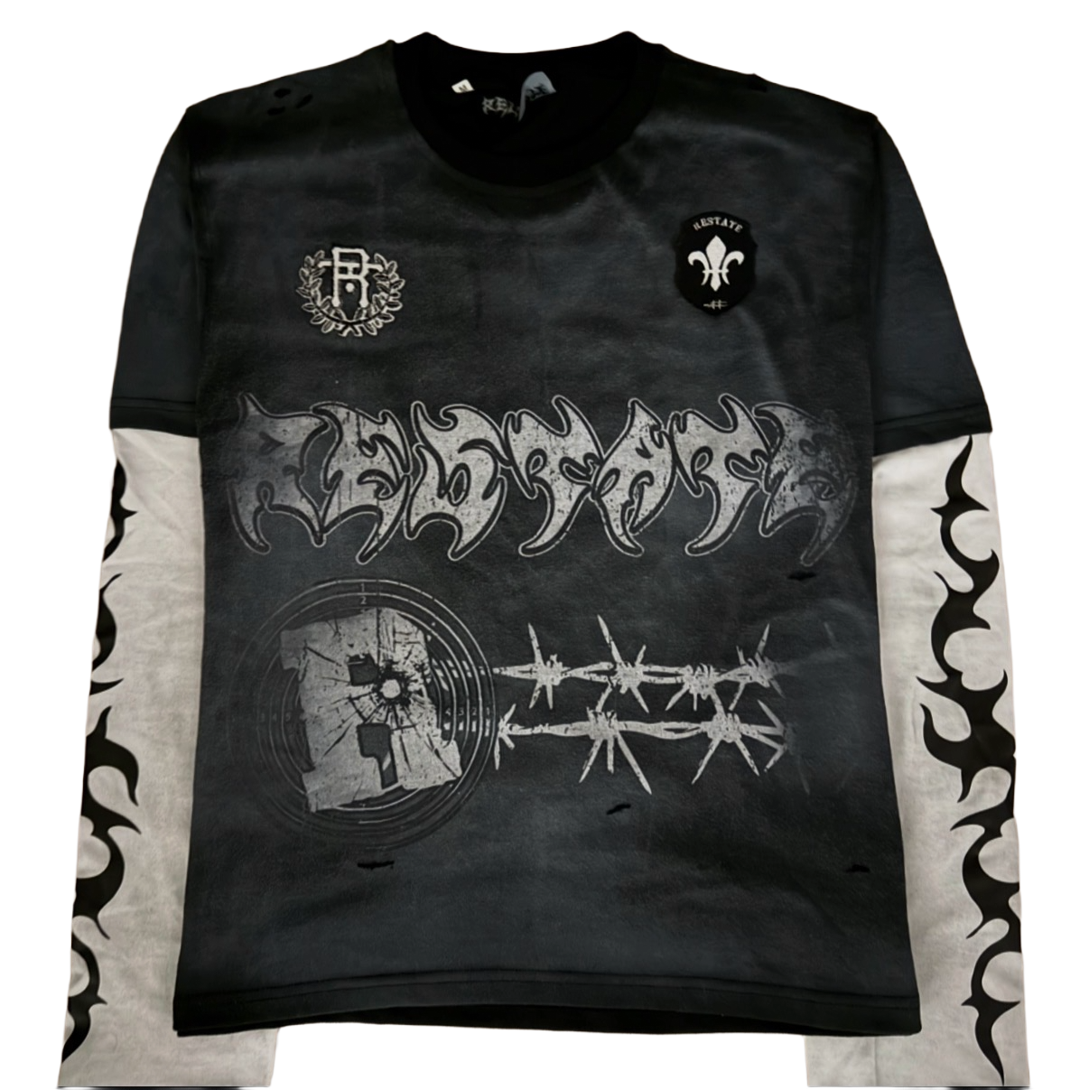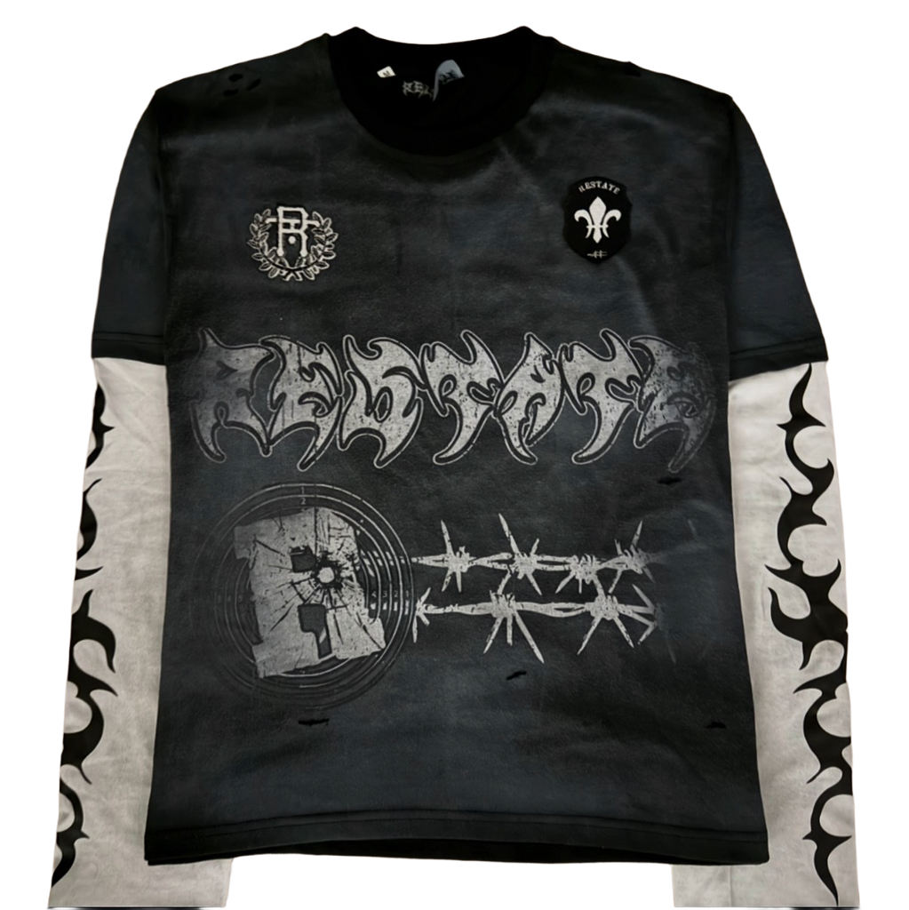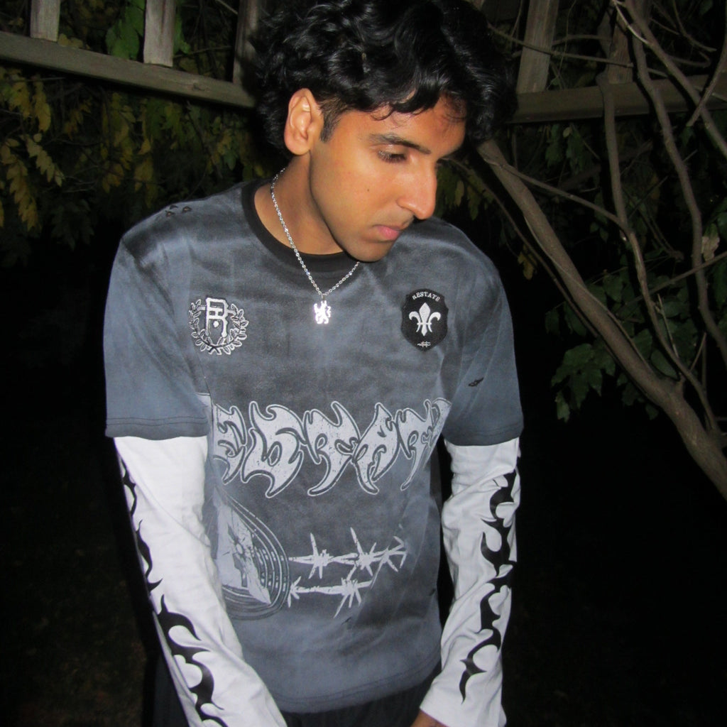 Cut from heavyweight cotton and washed to a sunfaded black, this tee carries a raw, worn-in presence. Each piece is hand-finished with subtle distressing and layered contrast sleeves that feature a vintage, smoke-washed effect and flame detailing. Faded graphics and embroidered crests reinforce the piece’s raw structure and deliberate wear.