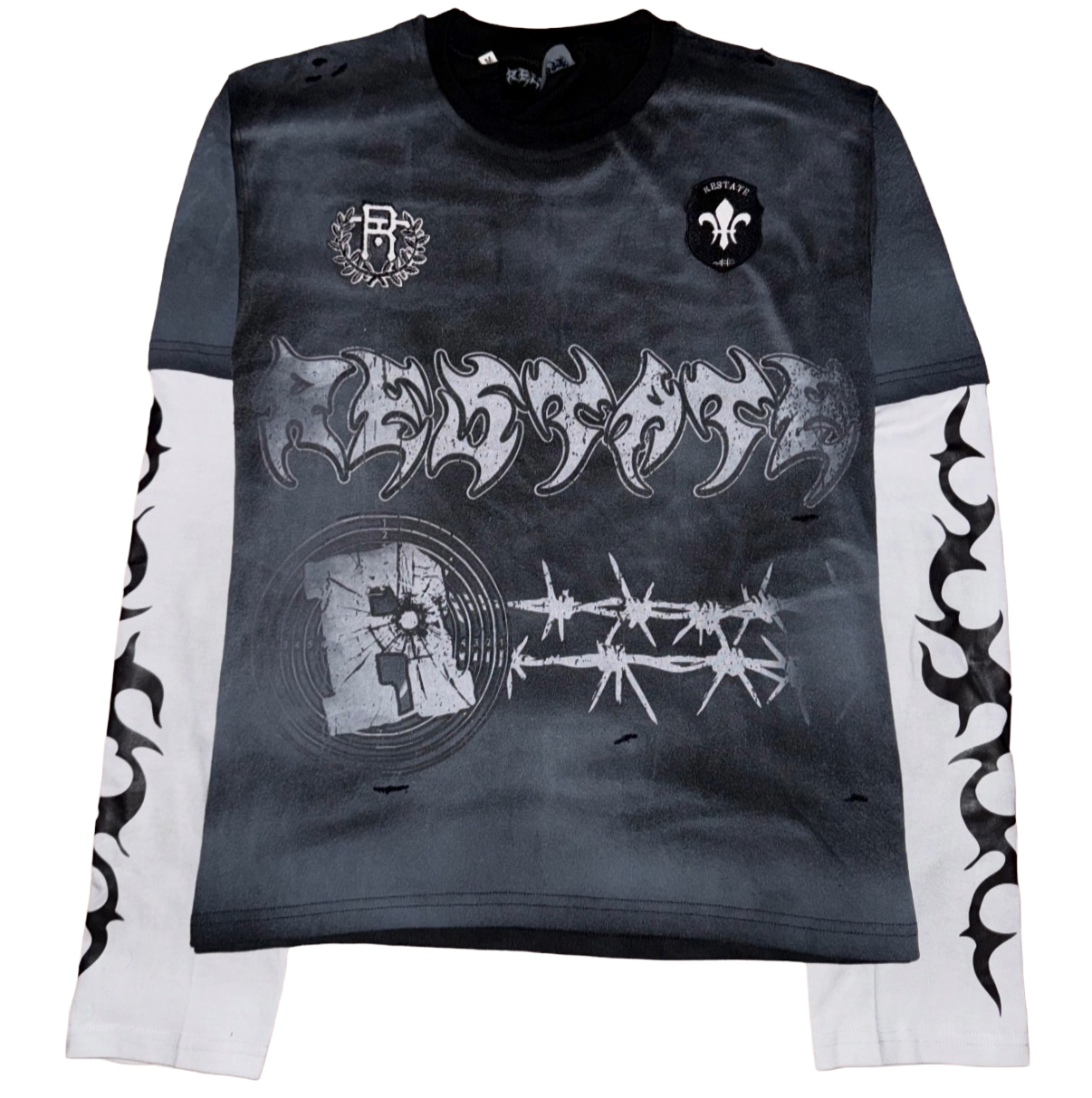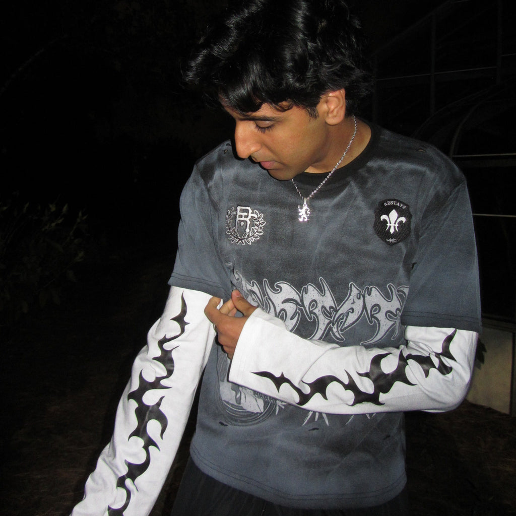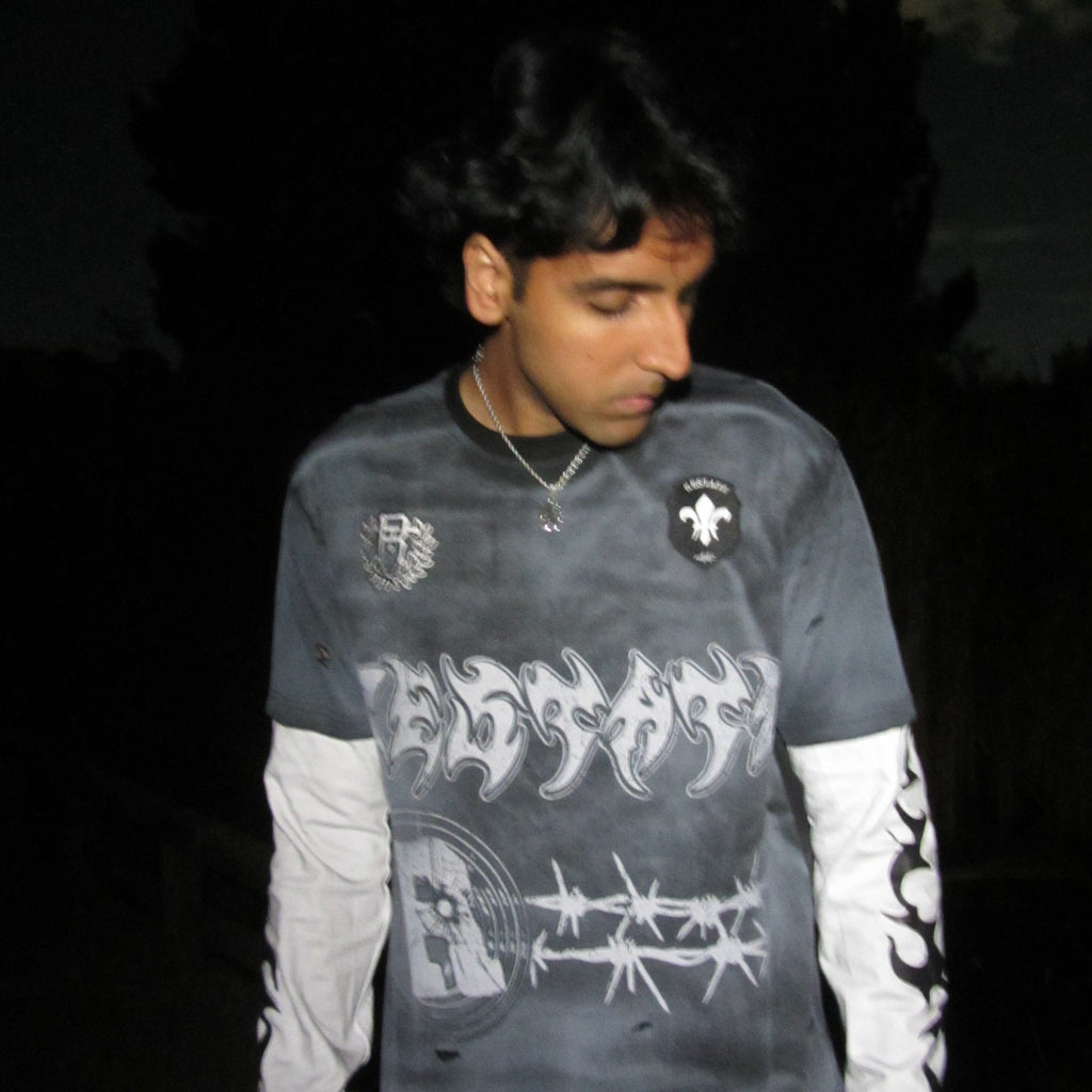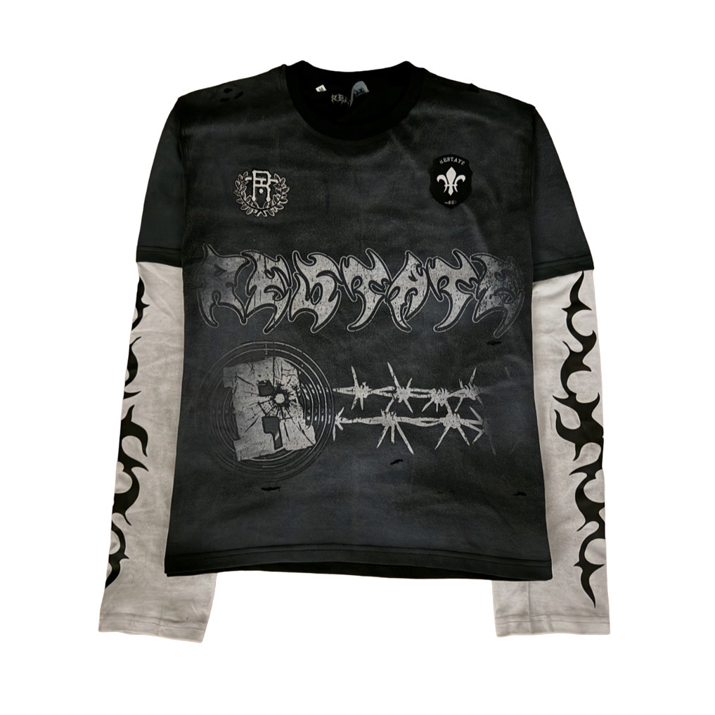 Cut from heavyweight cotton and washed to a sunfaded black, this tee carries a raw, worn-in presence. Each piece is hand-finished with subtle distressing and layered contrast sleeves that feature a vintage, smoke-washed effect and flame detailing. Faded graphics and embroidered crests reinforce the piece’s raw structure and deliberate wear.